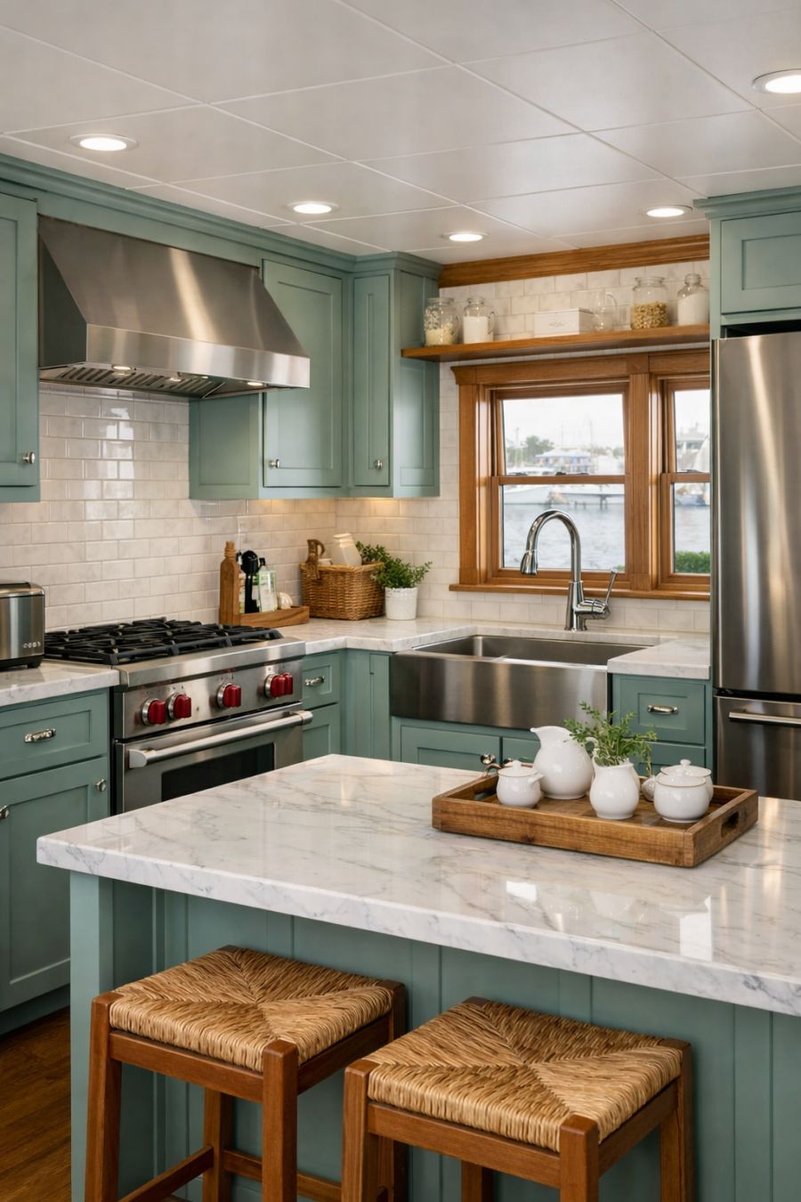 The kitchen is a chef's dream, combining modern conveniences with classic design elements. Shaker-style cabinets, painted in a soft seafoam green, offer ample storage, while the countertops are crafted from polished white marble, providing a clean and sophisticated surface for meal preparation. State-of-the-art stainless steel appliances blend seamlessly with the traditional decor, ensuring that functionality is never compromised. The kitchen's open layout allows for easy interaction with guests, making it the perfect space for entertaining or simply enjoying a quiet morning coffee.