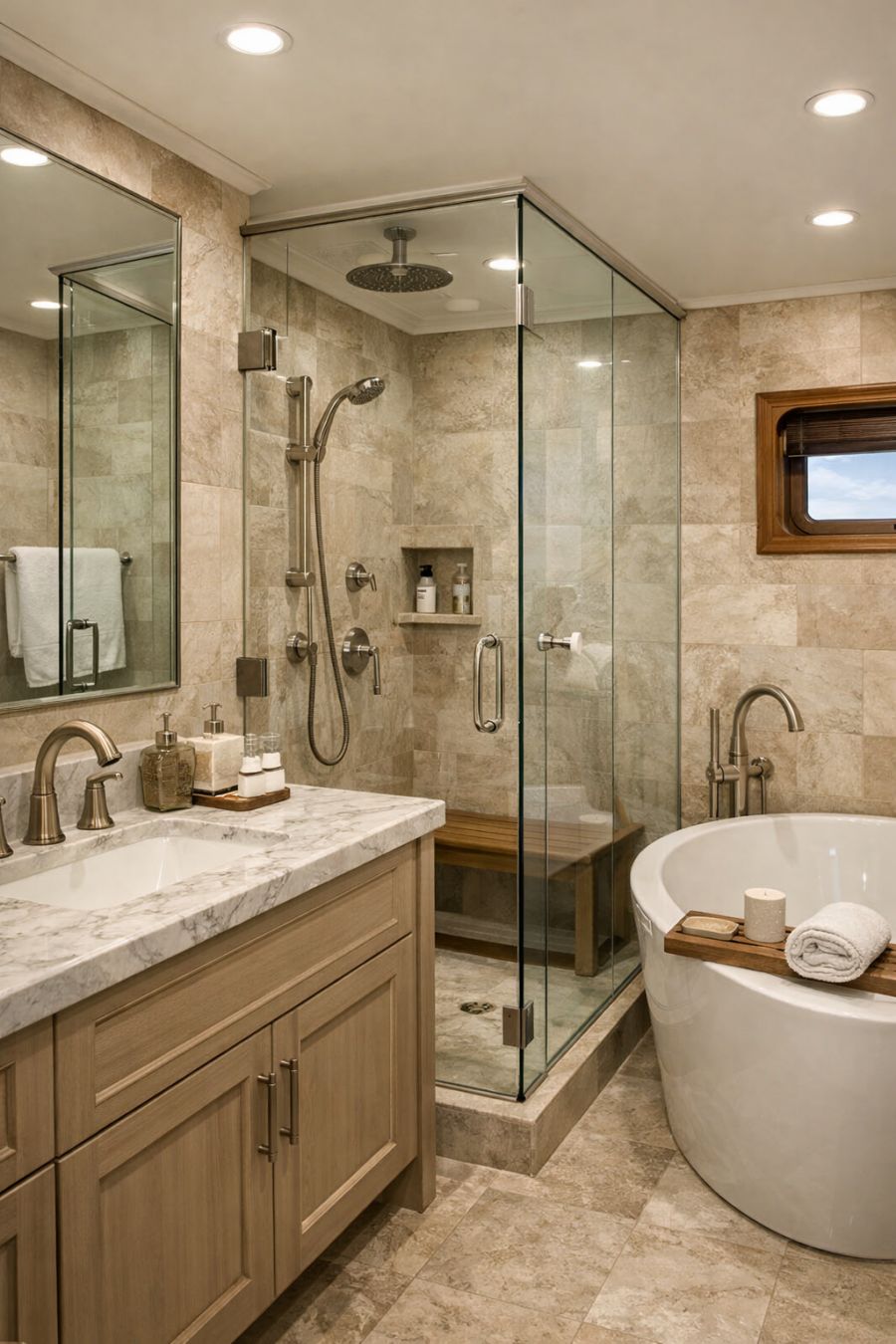 The bathroom is a study in elegance and functionality, featuring a layout that maximizes space and comfort. The walls are clad in natural stone tiles, creating a spa-like atmosphere that is both soothing and luxurious. A spacious walk-in shower, enclosed with frameless glass, provides a modern touch, while a deep soaking tub invites relaxation. The vanity, with its marble countertop and brushed nickel fixtures, offers ample space for toiletries, ensuring that style and practicality go hand in hand. Soft, neutral tones dominate the color palette, enhancing the serene ambiance of the space.