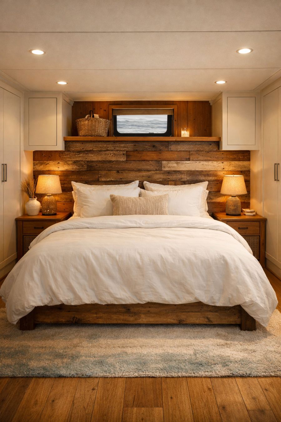 The bedroom is a sanctuary of peace and relaxation, designed to promote restful sleep and tranquility. Warm wooden floors are complemented by a plush area rug in soothing shades of sand and sea. The bed, dressed in crisp white linens, is framed by a headboard made of reclaimed wood, adding a rustic charm to the room. Built-in wardrobes provide plenty of storage without disrupting the room's minimalist aesthetic, while soft, ambient lighting creates a calming atmosphere perfect for winding down after a busy day.