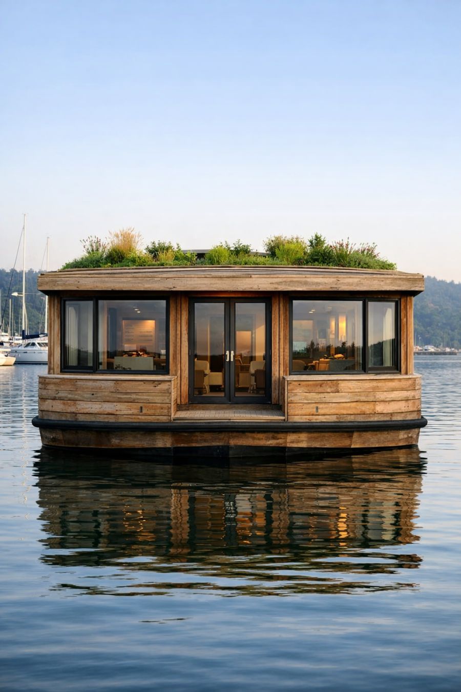 The exterior of this houseboat is a masterpiece of understated elegance. Its sleek, low-profile design allows it to blend seamlessly with the harbor's natural beauty. The structure is crafted from sustainable materials that mimic the warm hues of driftwood, giving it a natural, organic look. Large, panoramic windows line the sides, providing breathtaking views of the surrounding water and allowing natural light to flood the interior. The flat roof is adorned with a small garden, bringing a touch of greenery to the aquatic environment and enhancing the boat's eco-friendly appeal.