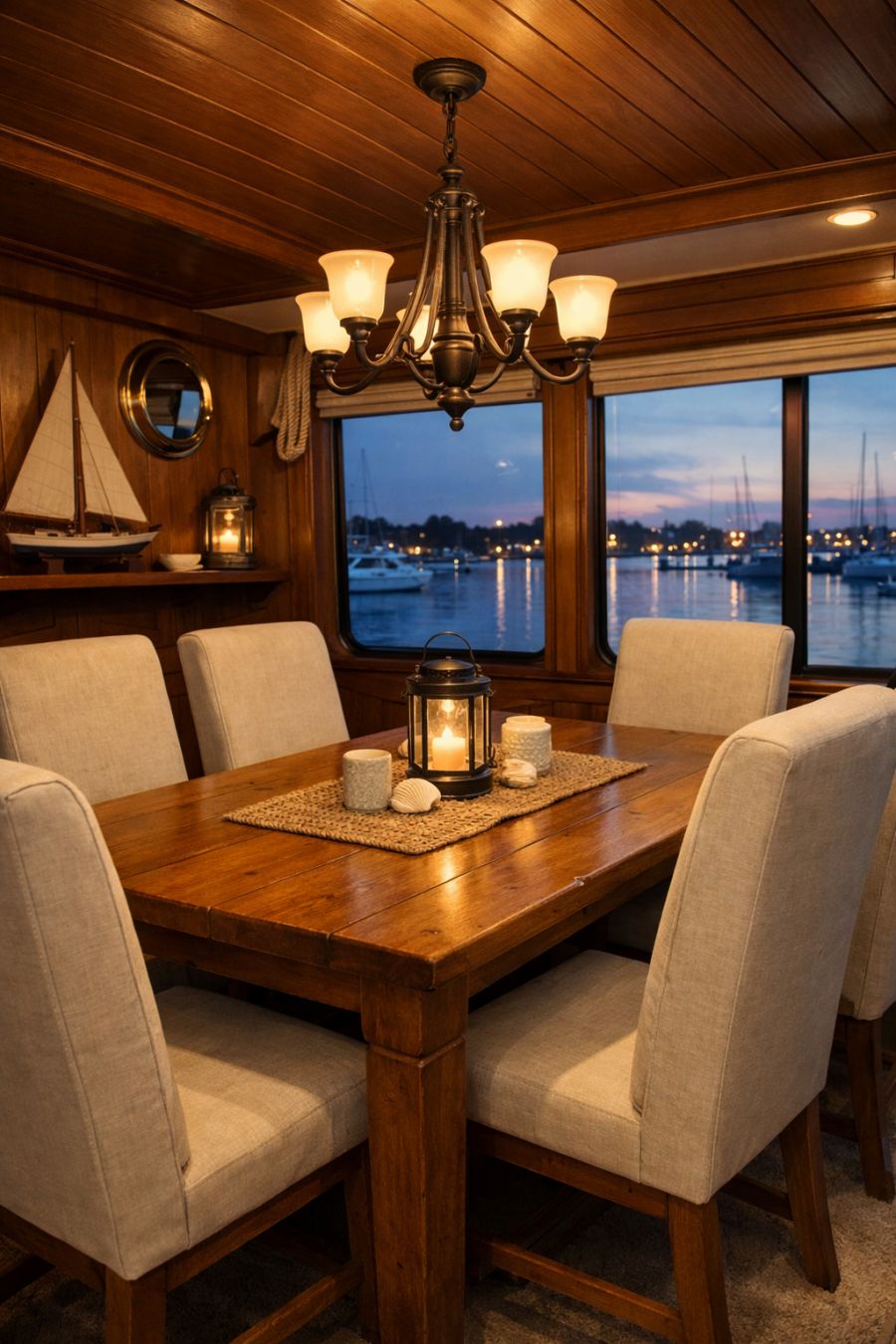The dining area is a harmonious blend of functionality and style, perfectly suited for intimate dinners or casual gatherings. A handcrafted wooden dining table sits at the center, surrounded by high-backed chairs upholstered in soft linen that complements the boat's coastal theme. Above, a simple, yet elegant chandelier casts a warm glow across the room, highlighting the intricate woodwork and nautical elements that adorn the walls. Large windows offer diners a spectacular view of the harbor, creating a dining experience that feels both luxurious and grounded.