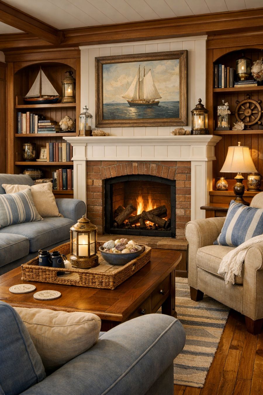 Step inside the living area, and you are greeted by a coastal traditional interior that exudes warmth and comfort. The space is adorned with warm wood accents that echo the tones of the exterior, creating a seamless transition from outside to inside. Soft upholstery in muted shades of blue and beige invites relaxation, while nautical-themed decor adds a subtle touch of whimsy. A central fireplace, framed by elegant built-in bookshelves, serves as the focal point, providing both warmth and a cozy gathering spot for family and friends.