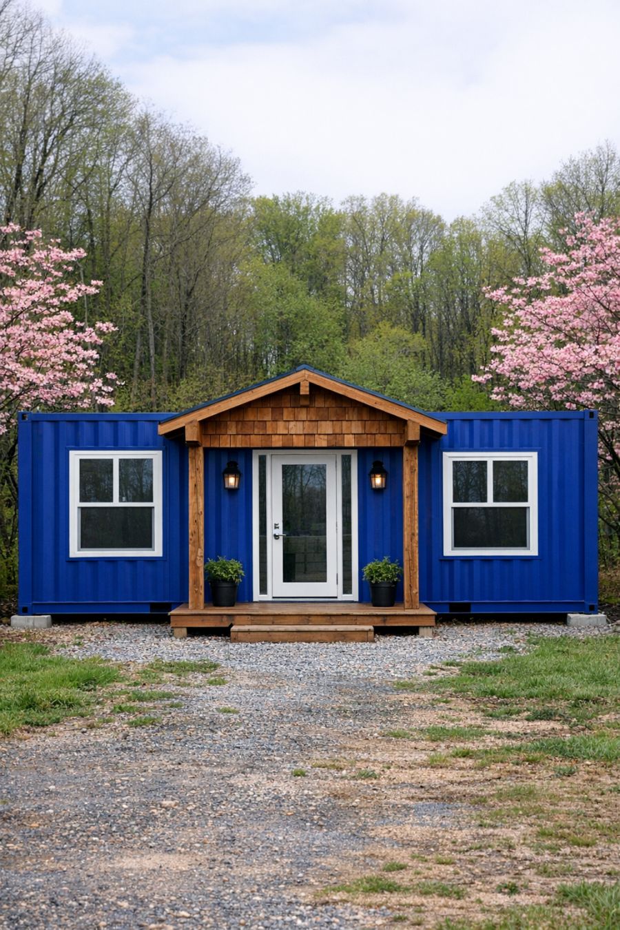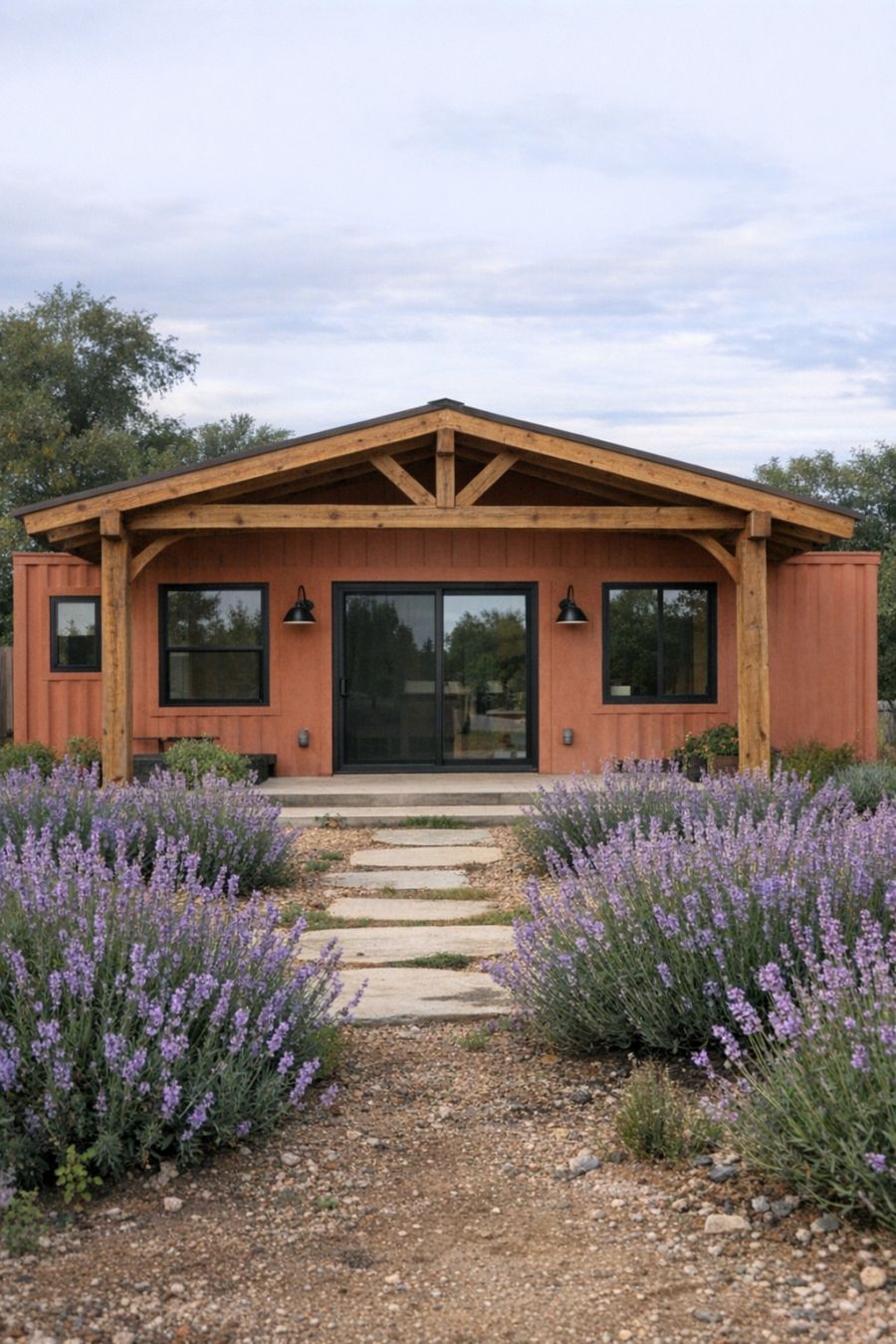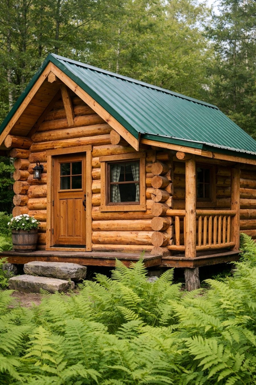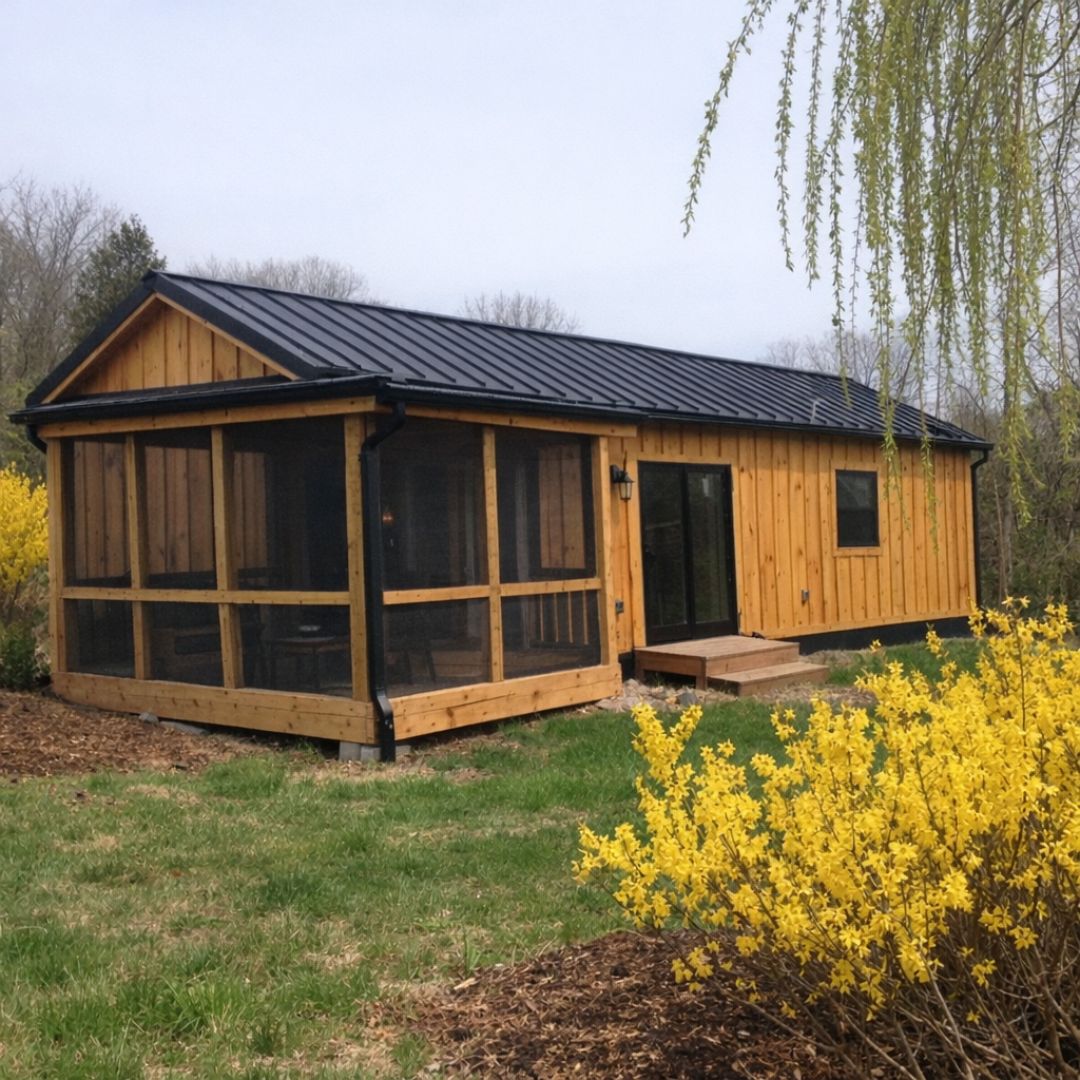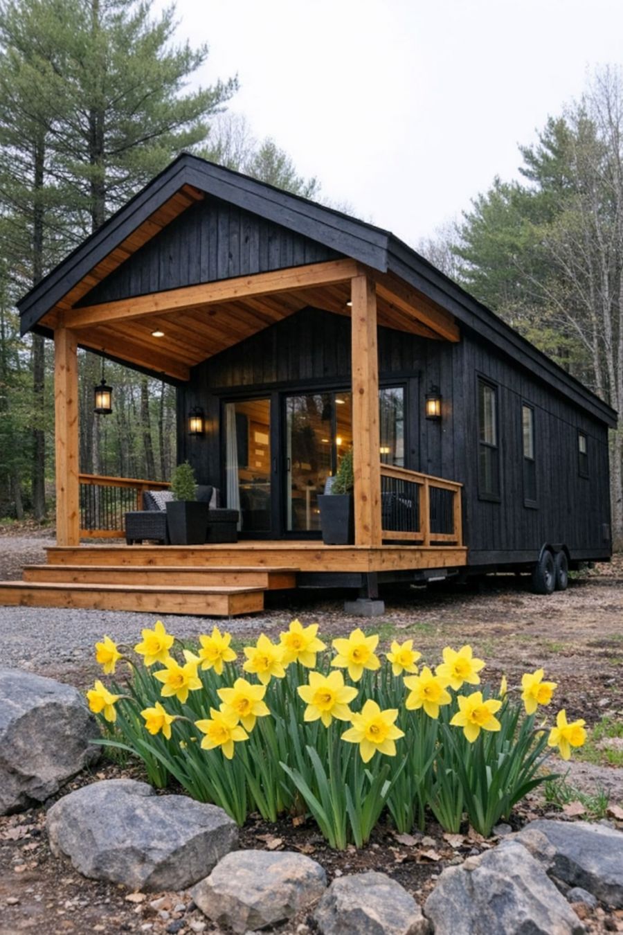 Come step inside this storybook red-door park model with frosted railings, mini evergreens, and a lantern-lit walkway. The interior is truly charming.