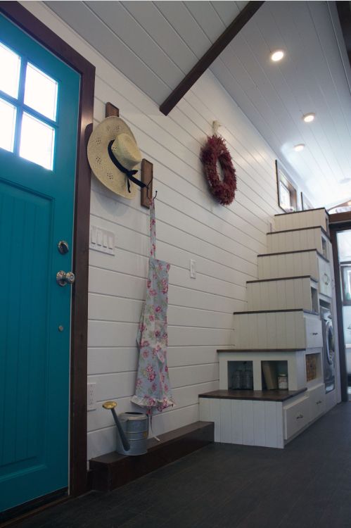 Another view close to the ground shows the combination washer/dryer that many find essential for tiny home living. (You can give up a lot of things, but a washer/dryer ain't one of them.) This one, you can see, is situated under the stairs.