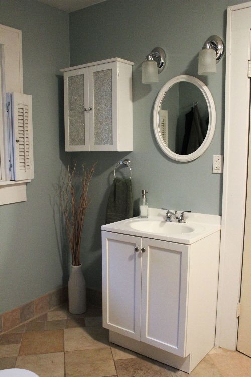 The bathroom is simple and classic with a white vanity and polished nickel fixtures. A greenish gray paint color creates a soothing spa-like atmosphere.