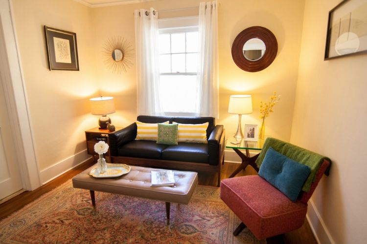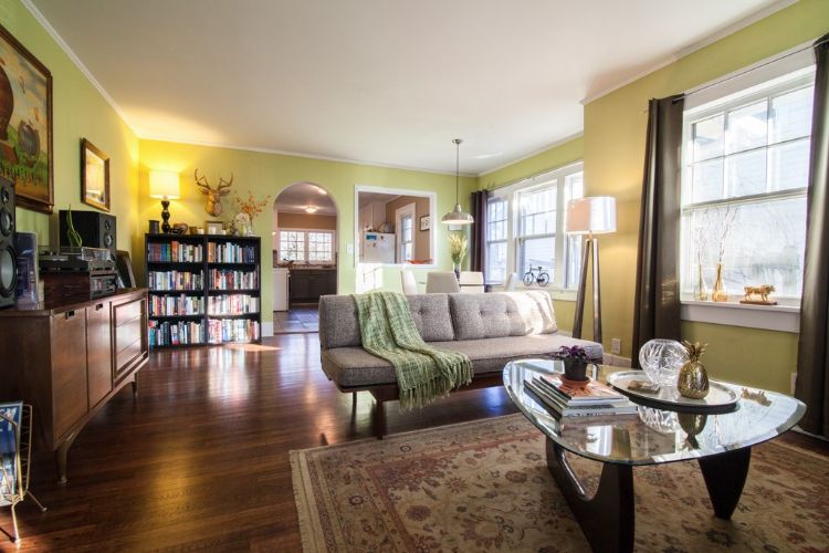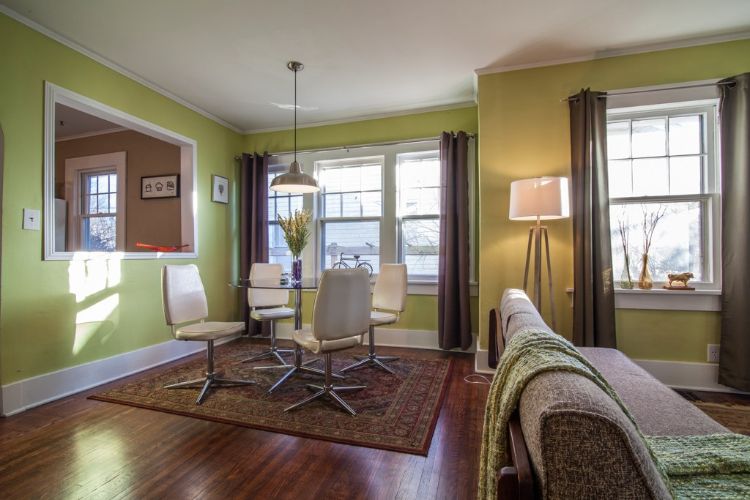 The living room features cheerful lime green walls and a beautiful selection of vintage pieces. Mid century modern is mixed with traditional, creating an eclectic and welcoming space.