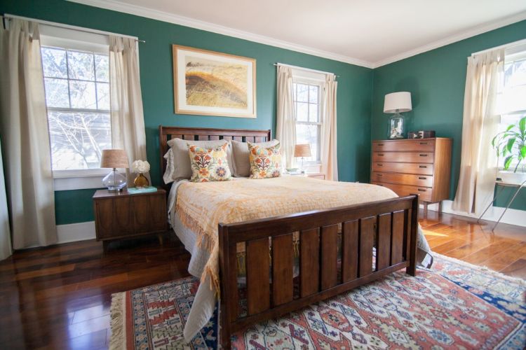 Another bold paint choice is found in the teal bedroom. Warm wood furniture grounds the space, while a tribal style rug is the show stopper.