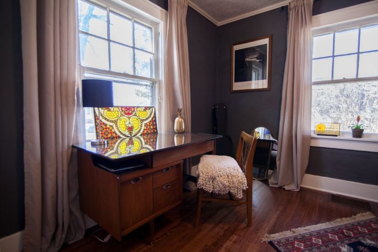 You'll find moody gray walls in the office softened by flowing curtains. The thick white molding throughout the home adds character and architectural interest.