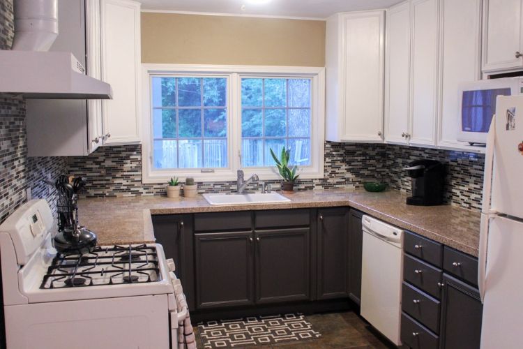 The kitchen is petite but functional. Gray lower cabinets are topped with a sandy colored granite counter top, while white upper cabinets lighten the space. A glass tile mosaic back splash ties all the colors together.