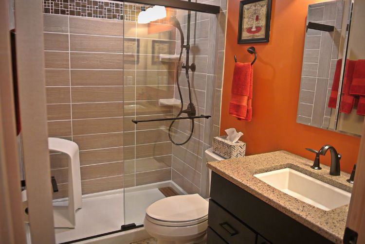 A roomy shower with full tiling takes up part of the bathroom. A flush toilet and a large sink and countertop keep this space from being too tiny.