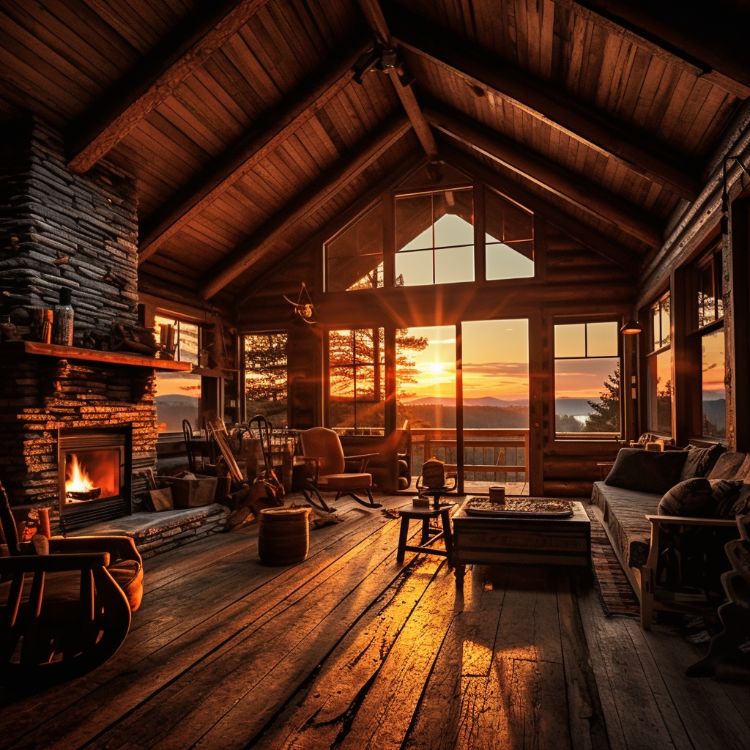 The study provides a tranquil space for moments of calm reflection. Natural light glows in the room, and the wooden desk and antique lamp provide the ideal set-up for tackling any work or creative projects. Books and magazines are neatly arranged on the shelves, waiting to be explored. Through the window, you can catch a glimpse of the trees that neighbor the side of the cabin facing the woods.
