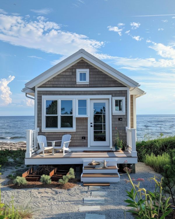 The exterior of the home embodies the essence of coastal elegance with its weathered wood siding, reminiscent of driftwood found along the shore. Crisp white trim highlights the windows and door, creating a fresh contrast that evokes a sense of seaside charm. A compact porch, adorned with a couple of Adirondack chairs, faces the ocean, offering a perfect spot for morning coffees or sunset watching. To complete the beach vibe, native coastal plants border the home, requiring minimal maintenance while maximizing natural beauty.