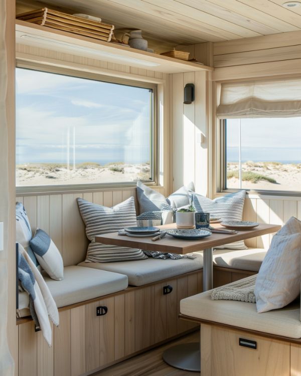 Adjacent to the living area, the dining space is ingeniously integrated to maximize the compact floor plan. A cozy nook by a large window offers a scenic backdrop for meals, furnished with a bench that doubles as extra storage and a table that can accommodate up to four people. The dining area blends seamlessly with the home's beach theme, featuring light wood finishes and cushions in stripes of blue and white, evoking images of beach umbrellas and towels laid out in the sun.