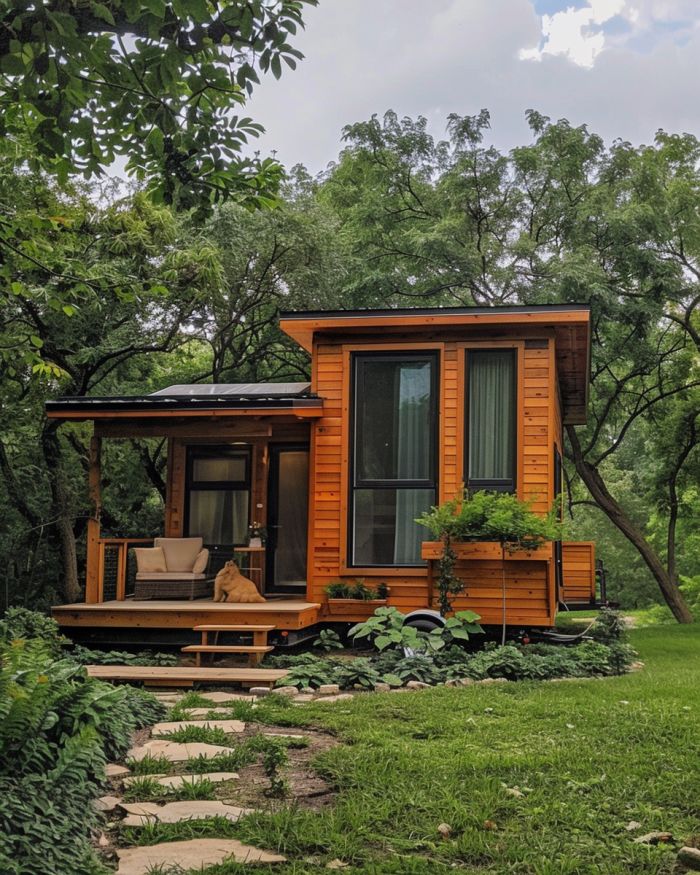 The exterior of this tiny home exudes charm and functionality, wrapped in warm, inviting wood tones that blend seamlessly with the natural surroundings. A small porch with a pet-friendly ramp and a lush green space for play and relaxation sets the tone for this pet-centric haven. The roof is equipped with solar panels to ensure sustainability, while large windows ensure ample natural light and a constant connection with the outdoors, perfect for pets who love to bask in the sun.