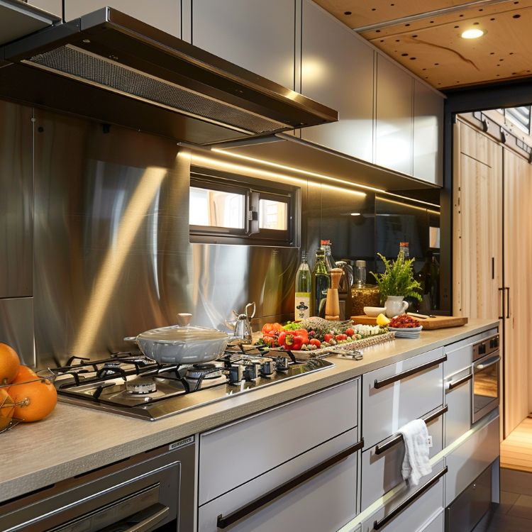 The kitchen area blends functionality with sleek, modern design. High-quality, pet-safe materials are used throughout, from the countertops to the cabinetry, ensuring durability and ease of maintenance. An innovative island doubles as a preparation space and a casual dining spot, with built-in drawers for pet food and supplies. State-of-the-art appliances are thoughtfully placed to maximize space and efficiency, catering to the needs of a modern, pet-loving household.