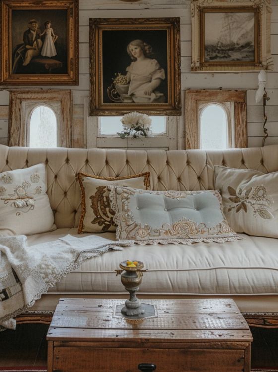 Upon entering, the living area greets visitors with a cozy, inviting ambiance. Victorian influences are evident in the ornamental patterns on the soft furnishings and the delicate lace curtains framing the windows. Modern minimalist furniture, including a plush sofa and a vintage wooden coffee table, maximize the space without sacrificing style or comfort. Ambient lighting and small, framed Victorian artwork add to the graceful charm of the room.