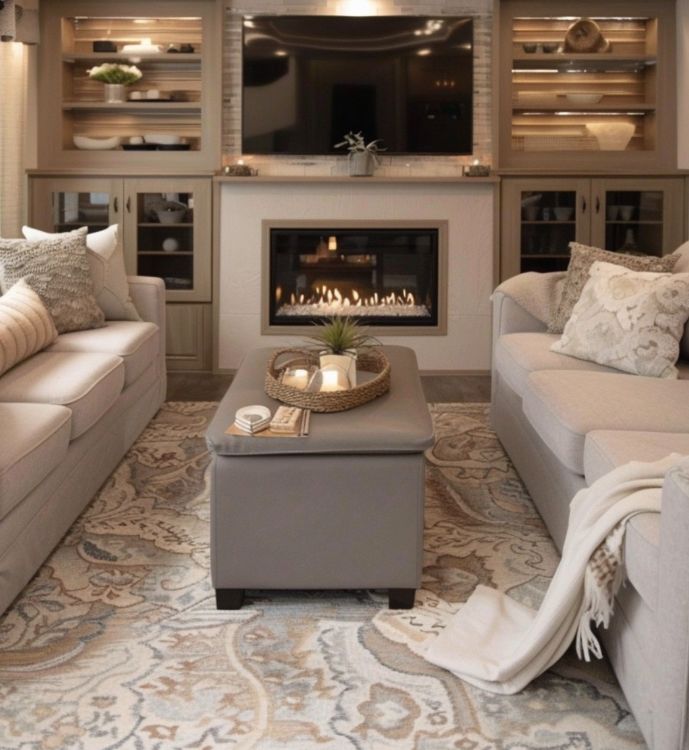Stepping into the living area, you're greeted by a traditional contemporary design palette. Plush seating arranged around a sleek, wall-mounted fireplace creates a cozy yet sophisticated ambiance. The walls, painted in soft neutral tones, feature tasteful crown moldings that accentuate the ceiling's elevated height. An area rug with subtle patterns anchors the space, while minimalist shelves with an array of books and decor items add character without clutter. Large windows flood the area with natural light, enhancing the spacious feel and creating a seamless connection with the outdoors.