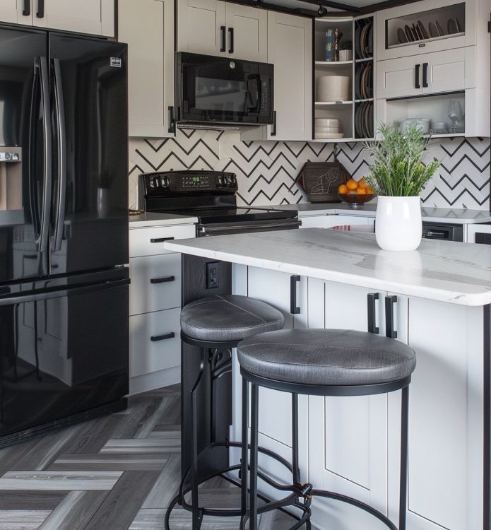 In the kitchen, functionality meets flair with high-end appliances seamlessly integrated into custom cabinetry. The cabinets, finished in a timeless white, provide ample storage and are accented with modern, matte black hardware. The countertops are a luxurious quartz, offering a durable and chic workspace. A stylish tile backsplash in a herringbone pattern adds texture and interest. The open layout includes a compact island that doubles as a breakfast bar, complete with contemporary barstools. Under-cabinet lighting and strategically placed recessed lights ensure the space is welcoming and well-lit.