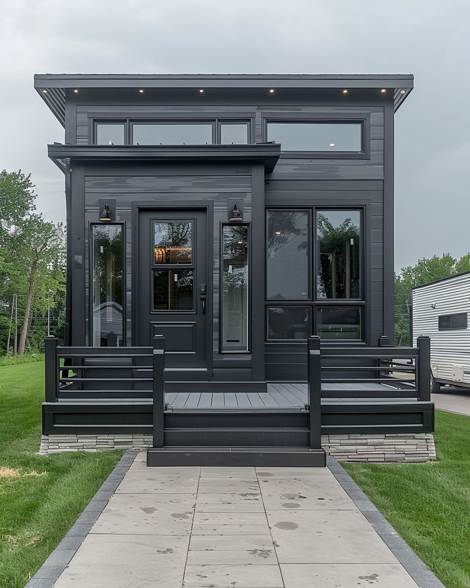The exterior of this park model RV is a striking combination of charcoal vinyl siding and sleek metal accents, presenting a balanced mix of durability and modern appeal. The charcoal siding offers a bold yet refined statement, contrasting beautifully with the shiny metal that lines the roof edges, window frames, and entrance steps. Large, energy-efficient windows provide ample natural light while the minimalist door with a glass pane adds a touch of contemporary elegance. The overall silhouette is clean and structured, exuding a sense of both sturdiness and style.