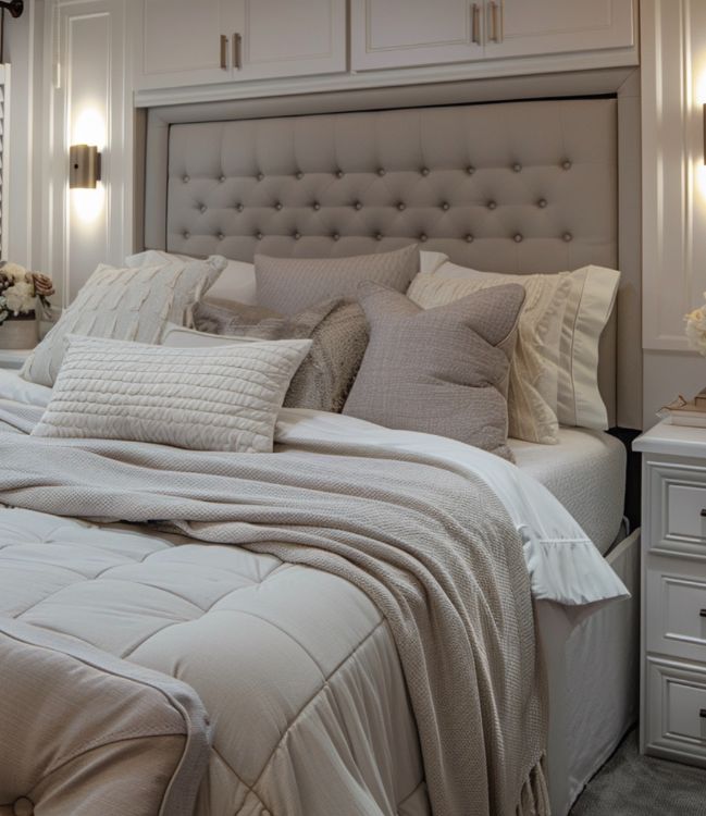 The bedroom is a sanctuary of comfort, designed with a traditional contemporary aesthetic that invites relaxation. A queen-sized bed with a tufted headboard anchors the room, flanked by matching nightstands with sleek lamps. The bedding is a mix of soft, high-quality linens in neutral tones, accented by decorative pillows with subtle patterns. A large wardrobe offers practical storage solutions, while a cozy reading nook by the window features a comfortable chair and small side table. The walls are painted in a calming, muted shade, encouraging a restful atmosphere.
