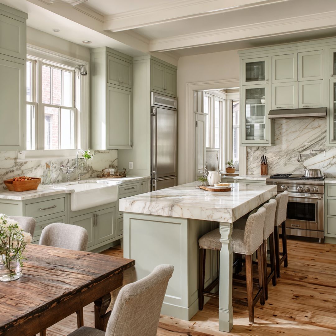 The kitchen is a delightful blend of functionality and style, featuring marble countertops and a farmhouse sink that nod to the home's vintage roots. Custom cabinetry, painted in a muted pastel hue, provides ample storage while maintaining the kitchen's airy feel. State-of-the-art stainless steel appliances are seamlessly integrated, offering modern convenience without disrupting the room's classic aesthetic. A central island provides additional prep space and doubles as a casual dining area, surrounded by high-backed stools for a comfortable gathering spot.