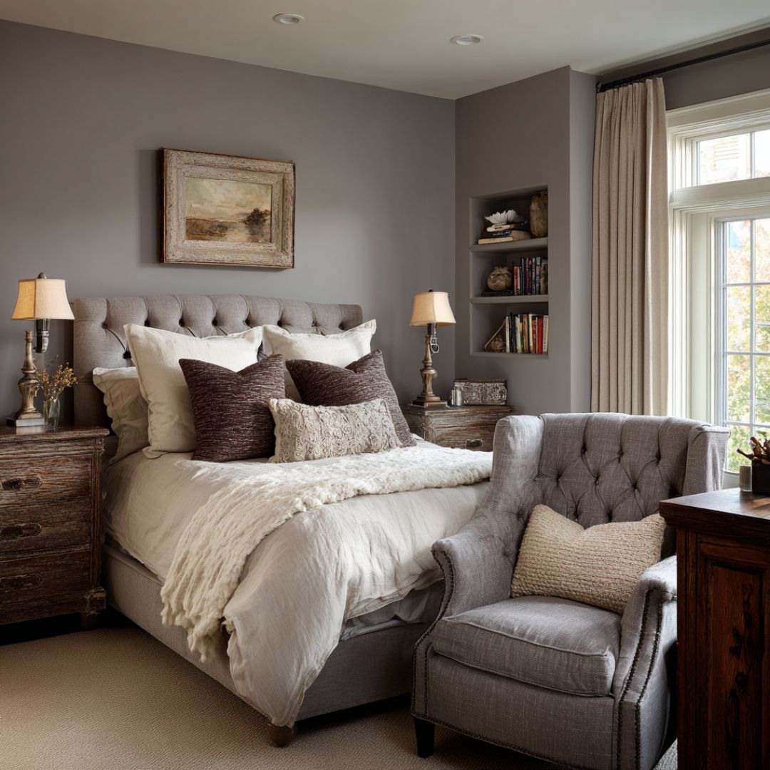 The bedroom is a serene retreat, designed to promote relaxation and restfulness. The walls are painted in a calming dove gray, creating a soothing backdrop for the room's elegant furnishings. A plush, upholstered bed takes center stage, adorned with luxurious linens and a collection of textured throw pillows. Vintage bedside tables flank the bed, each topped with a delicate reading lamp. A cozy reading nook, complete with a tufted armchair and a small bookshelf, offers a quiet corner for reflection and escape.