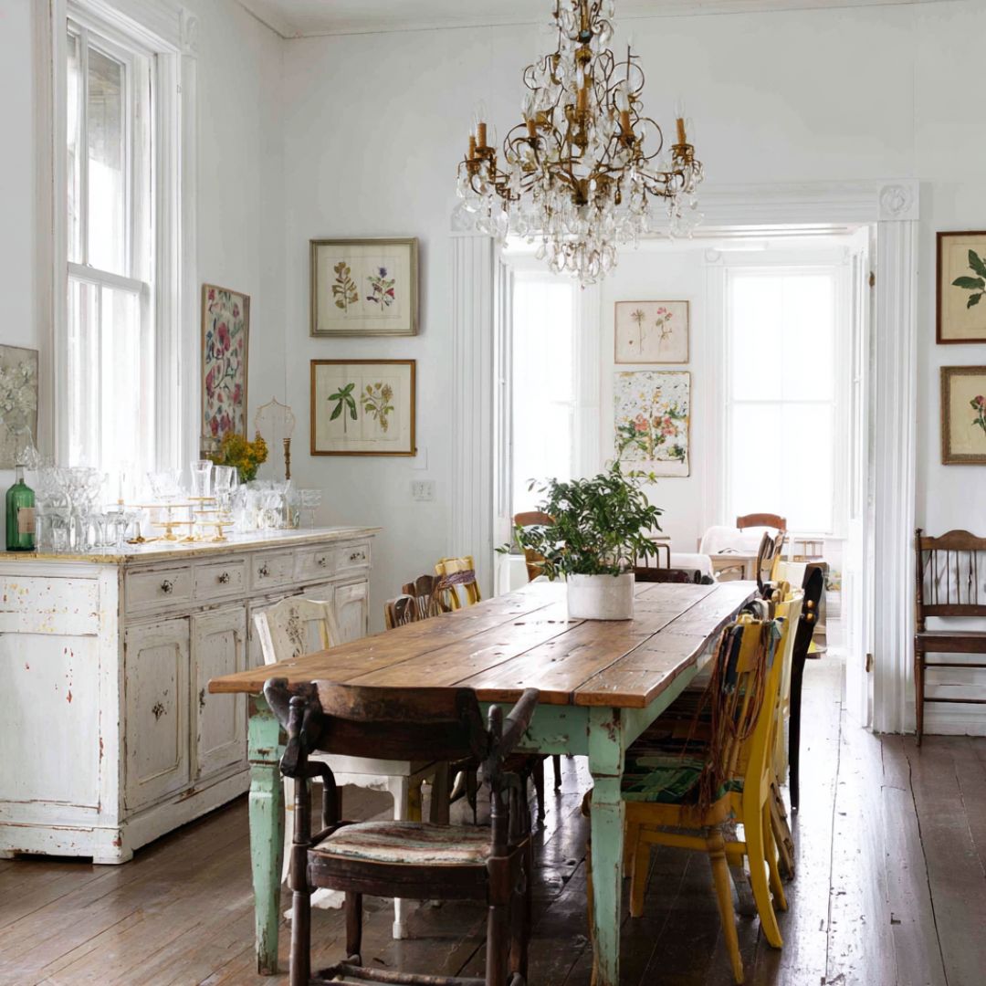 The dining area is a seamless extension of the living space, characterized by its elegant simplicity and thoughtful design. A large oak dining table takes center stage, surrounded by mismatched vintage chairs that add an eclectic touch to the room. An ornate chandelier hangs above, casting a soft, ambient light that enhances the room's cozy atmosphere. The walls are decorated with framed botanical prints, and an antique sideboard hosts a collection of fine china and glassware, completing the space's sophisticated yet homey feel.