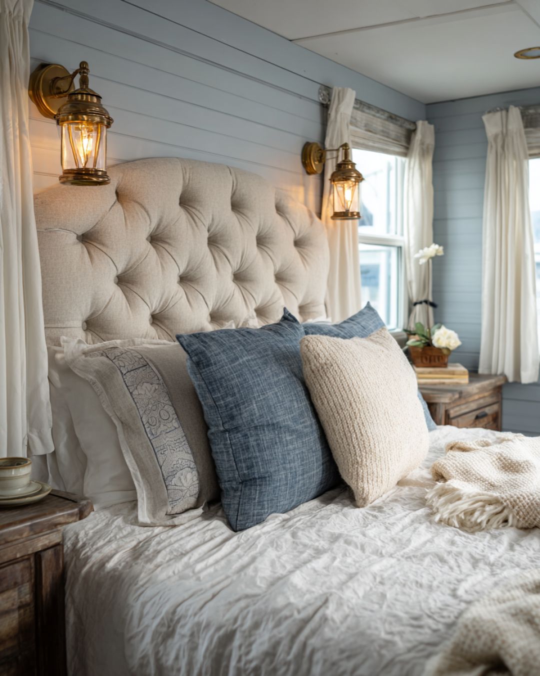 The bedroom offers a tranquil retreat, enveloped in soft blues and whites that exude calmness and restfulness. A tufted beige headboard stands as a focal point, complemented by plush linens that promise comfort. Vintage nautical lamps add a touch of character, casting a warm, soothing light. This bedroom is designed to be a peaceful haven, where every detail contributes to a sense of serene escape.