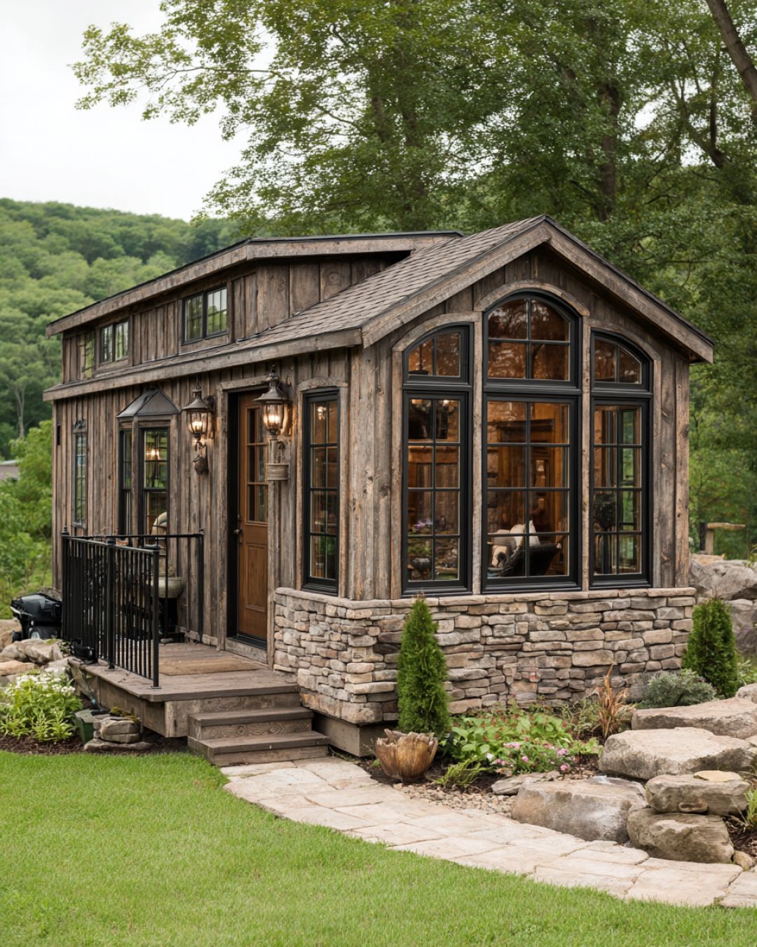The exterior of this charming cottage is a testament to rustic elegance, nestled perfectly within its picturesque countryside setting. Weathered wooden siding paired with stone accents on the lower half of the structure exudes a warm and inviting character. A quaint stone pathway leads up to the entrance, which is marked by a small wooden porch adorned with simple black railings. Large, multi-paned windows with soft arches grace the front façade, allowing natural light to flood the cozy interior, all while earthy tones of warm browns, muted greens, and soft creams harmoniously complement the lush surrounding greenery.