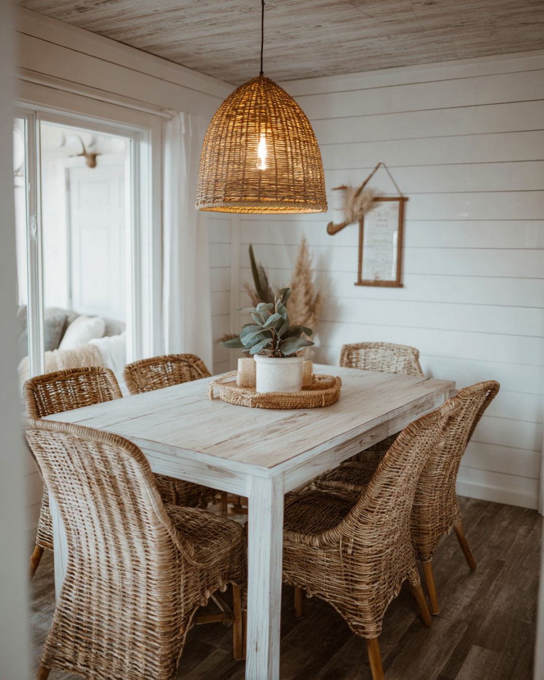 Continuing the beachy aesthetic, the dining area is a delightful blend of rustic and coastal elegance. A whitewashed wooden table serves as the centerpiece, surrounded by wicker chairs that evoke a sense of casual comfort. A warm pendant light hangs above, casting a gentle glow that enhances the inviting atmosphere. Vertical shiplap paneling adds texture and depth to the walls, ensuring the dining space is as stylish as it is welcoming.