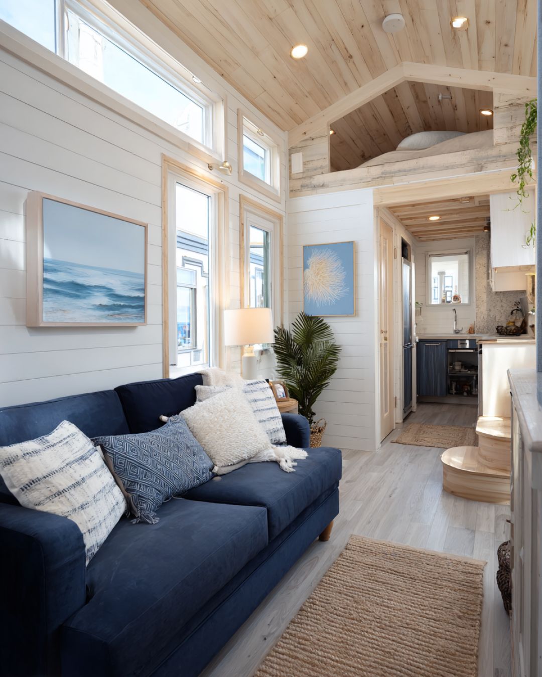 Step inside, and you're greeted by a living area that embodies a harmonious blend of modern practicality and coastal charm. Soft sandy walls and white shiplap accents set a tranquil backdrop, while light oak wood flooring adds warmth and continuity. A cozy navy blue couch invites relaxation, perfectly paired with coastal-themed artwork that enhances the serene vibe. The space is airy and open, creating a seamless flow that feels both spacious and intimate, ideal for unwinding or entertaining.
