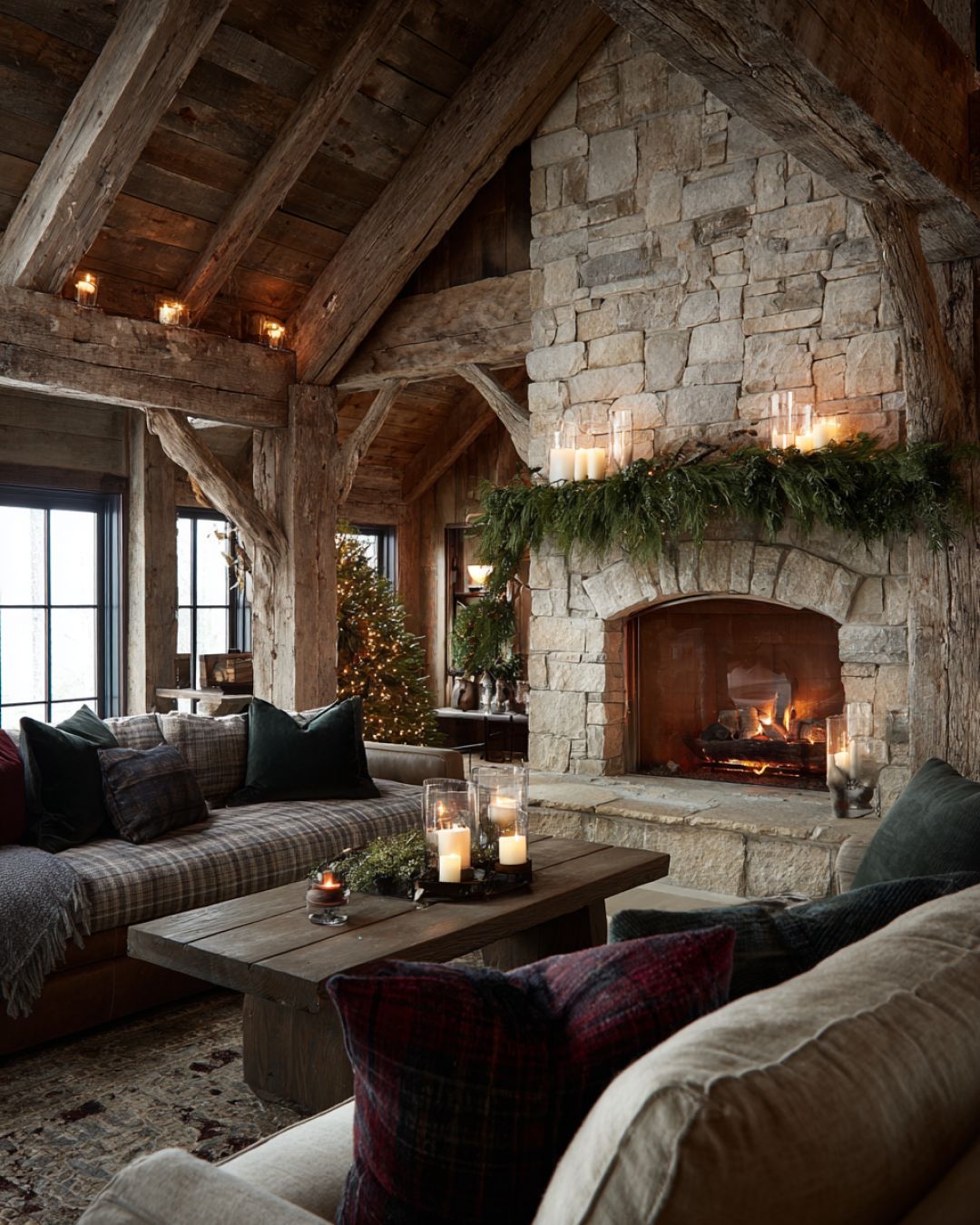 Inside, the living area is a delightful blend of rustic charm and modern comfort. A grand stone fireplace serves as the centerpiece, where flickering candles and garlands of evergreen create a cozy ambiance. Plush seating is arranged around the hearth, inviting family and friends to gather and enjoy the warmth. The decor features a neutral palette with pops of deep green and red, enhancing the holiday spirit while maintaining a timeless aesthetic.