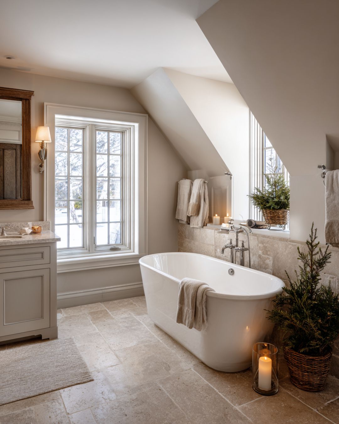The bathroom is a sanctuary of relaxation, featuring a design that marries functionality with timeless elegance. The floors are crafted from heated stone tiles, providing warmth underfoot, while the walls are clad in a light, neutral hue. A freestanding bathtub serves as the focal point, offering a luxurious spot to unwind. Fixtures in brushed nickel add a touch of sophistication, and a large mirror enhances the sense of space. Candles and evergreen sprigs are thoughtfully placed, infusing the area with a calming scent and a hint of holiday spirit.