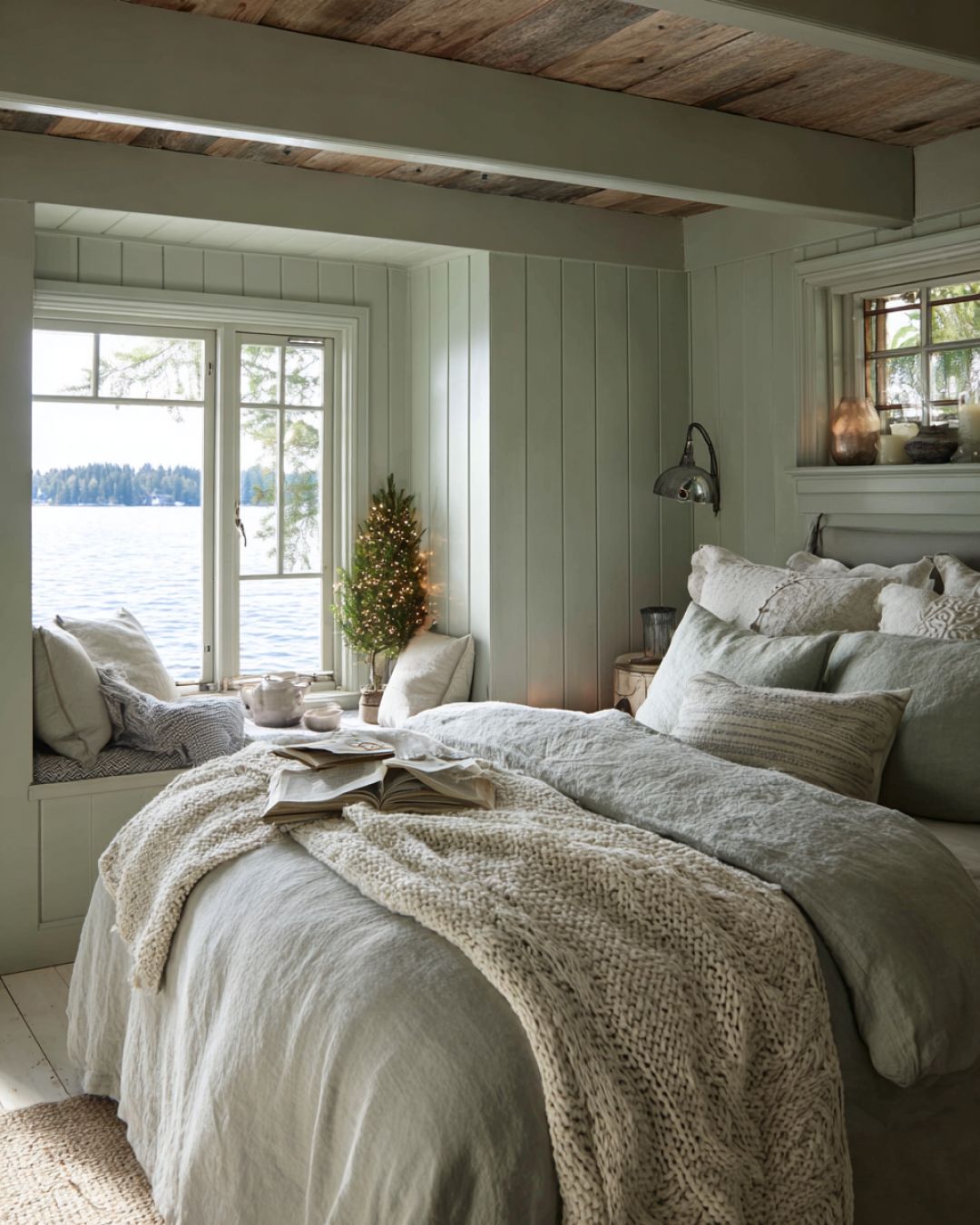 The bedroom is a serene retreat, designed to offer restful nights and peaceful mornings. A large, plush bed is dressed in layers of soft linens and cozy blankets, inviting relaxation. The walls are painted in a calming shade of sage, complemented by natural wood accents. A small nook by the window provides a perfect spot for reading, with a view of the tranquil lake beyond. Subtle holiday decorations, such as a small evergreen tree and twinkling fairy lights, add a touch of magic to the space.