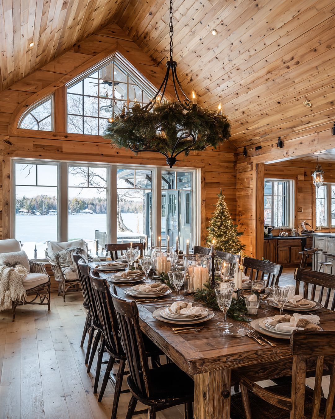 The dining area is a harmonious extension of the living space, designed to host festive gatherings. A large wooden dining table takes center stage, elegantly set with fine china and crystal glassware. Overhead, a chandelier crafted from wrought iron and adorned with evergreen boughs casts a soft glow. The walls are lined with wooden paneling, and a large window provides a scenic view of the snow-covered lake, offering a perfect backdrop for holiday feasts.