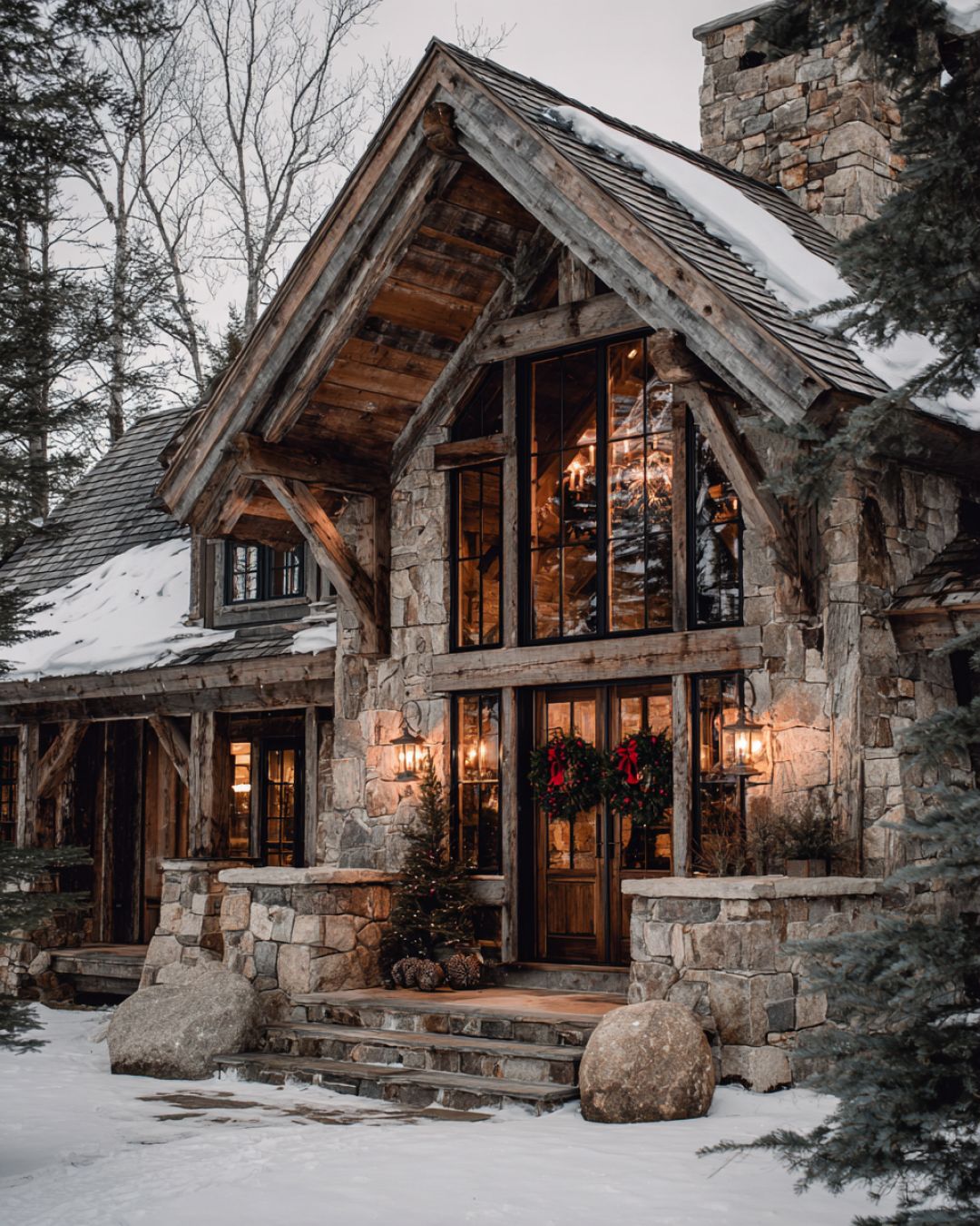 The exterior of the cottage is a picturesque scene straight out of a winter wonderland. The facade is constructed with rustic stonework and wooden beams, perfectly complementing the natural surroundings. Snow gently dusts the sloped roof, creating a cozy and inviting appearance. Large windows offer a glimpse of the warm glow from within, while wreaths adorned with pinecones and red berries hang on the doors, adding a festive touch to the entrance.