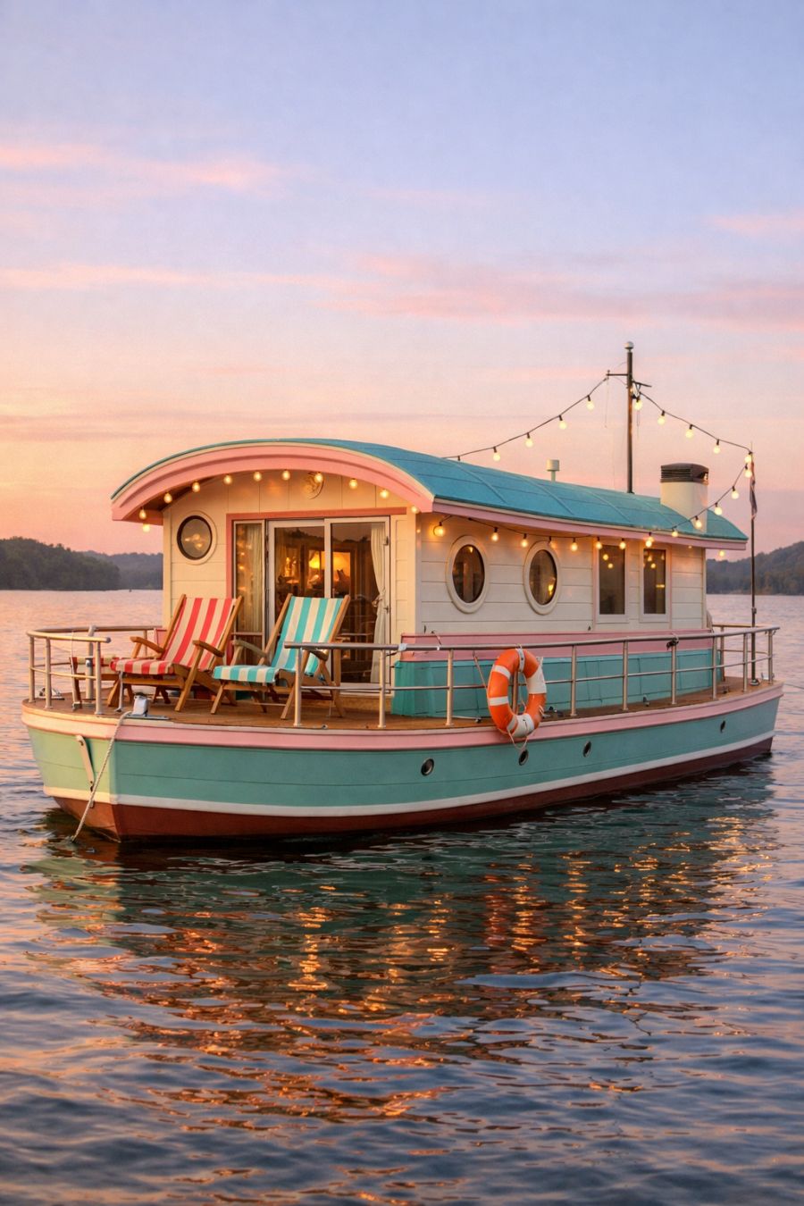 The exterior of this houseboat is a delightful homage to vintage design, with its soft pastel hues reminiscent of a postcard-perfect scene. The houseboat features a classic silhouette, with a gently curved rooftop and charming porthole windows that evoke the spirit of maritime adventure. The deck is adorned with retro-style deck chairs and string lights, creating an inviting atmosphere for sunset gazing and evening gatherings. The overall aesthetic is both whimsical and elegant, blending seamlessly with the tranquil waters of the lake it calls home.