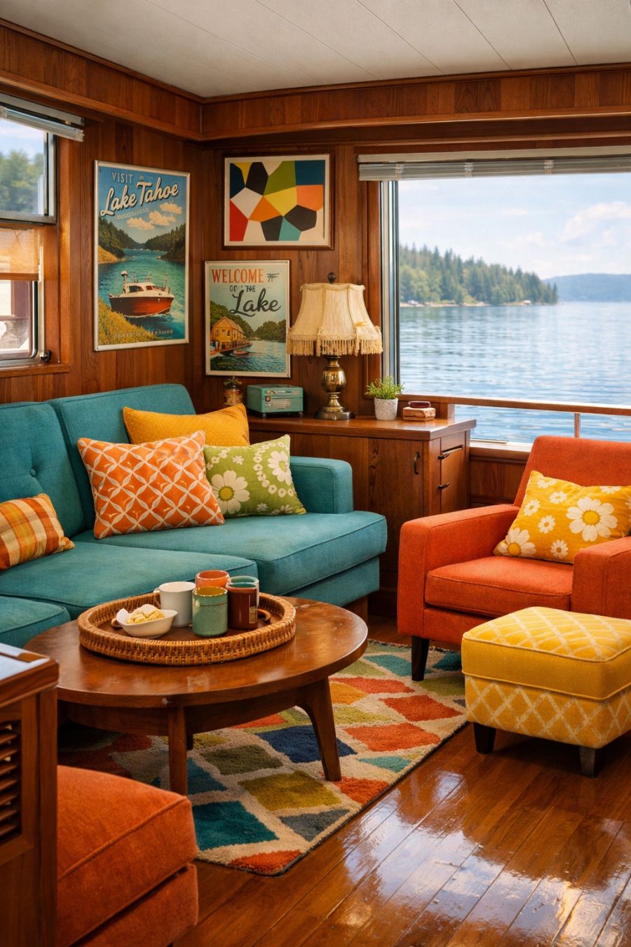 Step inside the living area, and you're greeted by a retro lake interior with cheerful colors and nostalgic charm. The walls are adorned with vintage travel posters and mid-century modern art pieces, bringing warmth and personality to the space. Plush, brightly colored furnishings invite relaxation, while a mix of patterned throw pillows adds a playful touch. The hardwood floors, polished to a high shine, reflect the natural light that pours in through large windows, offering uninterrupted views of the shimmering lake.
