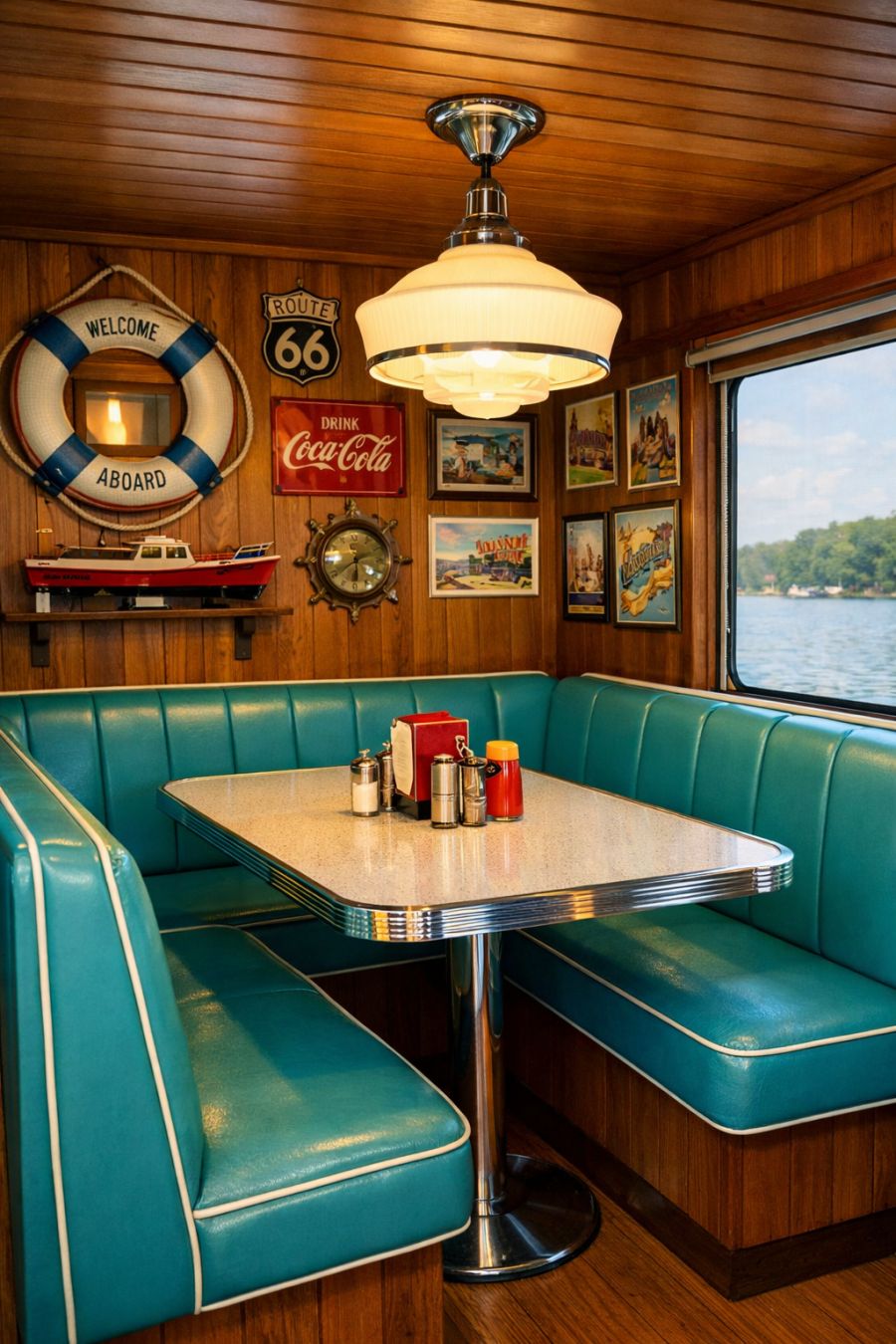 The dining area is a vibrant celebration of retro style, featuring a classic diner-inspired table with chrome accents and cushioned booths in a lively shade of turquoise. Overhead, a vintage pendant light casts a warm glow, enhancing the cozy ambiance of the space. The walls are decorated with retro memorabilia and framed vintage postcards, creating a conversation starter for guests. With ample seating and a view of the water, it’s the perfect spot for enjoying leisurely meals while reminiscing about the golden days of travel.