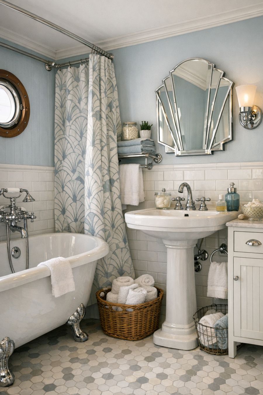 The bathroom is a testament to timeless style, featuring a classic clawfoot tub and a pedestal sink set against a backdrop of subway tiles. The color palette is a soothing blend of soft blues and whites, creating a spa-like atmosphere that invites relaxation. Chrome fixtures add a touch of elegance, while vintage-inspired accessories, such as an art deco mirror and patterned shower curtain, enhance the nostalgic feel. Thoughtful storage solutions ensure functionality without compromising on style, making this bathroom both beautiful and practical.