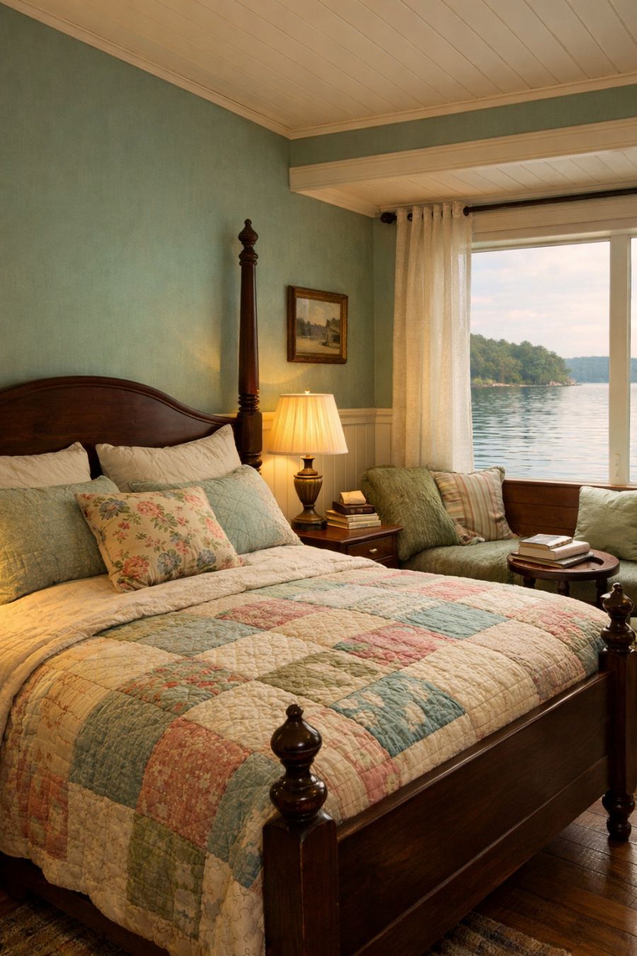 The bedroom is a serene retreat, combining vintage charm with tranquil lake views. The walls are painted in a calming shade of seafoam green, accented by white wainscoting for a classic touch. A four-poster bed with a quilted bedspread in soft pastels anchors the room, while retro bedside lamps provide a warm, inviting glow. The space is completed with a cozy reading nook by the window, where one can enjoy a good book while taking in the peaceful scenery.
