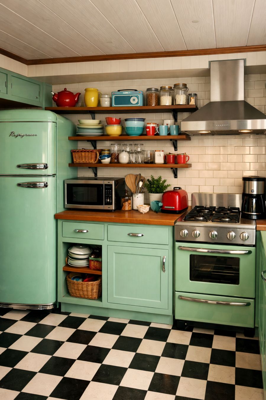 The kitchen is a delightful blend of retro aesthetics and modern functionality, with mint green cabinetry and sleek chrome hardware. A vintage-inspired refrigerator stands proudly in the corner, complementing the checkerboard tile floor that adds a playful touch to the space. Open shelving displays an array of colorful dishware, while modern appliances are discreetly integrated to maintain the nostalgic vibe. This kitchen invites culinary creativity with its cheerful atmosphere and thoughtful design.