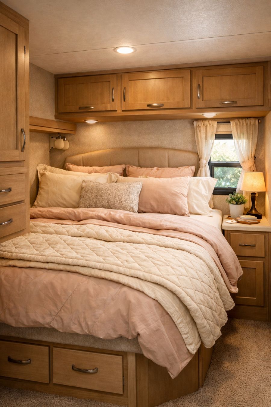 Tucked away at the rear of the camper, the bedroom area offers a serene retreat with its soft, muted color palette and cozy design. The bed is dressed in luxurious linens in shades of ivory and soft pink, with a quilted throw adding texture and warmth. Built-in storage solutions make the most of every inch, with drawers and cabinets seamlessly integrated into the space. A small window, framed by delicate curtains, allows natural light to filter in, creating a peaceful ambiance. The bedroom is a haven of tranquility, perfect for unwinding after a day of exploration.