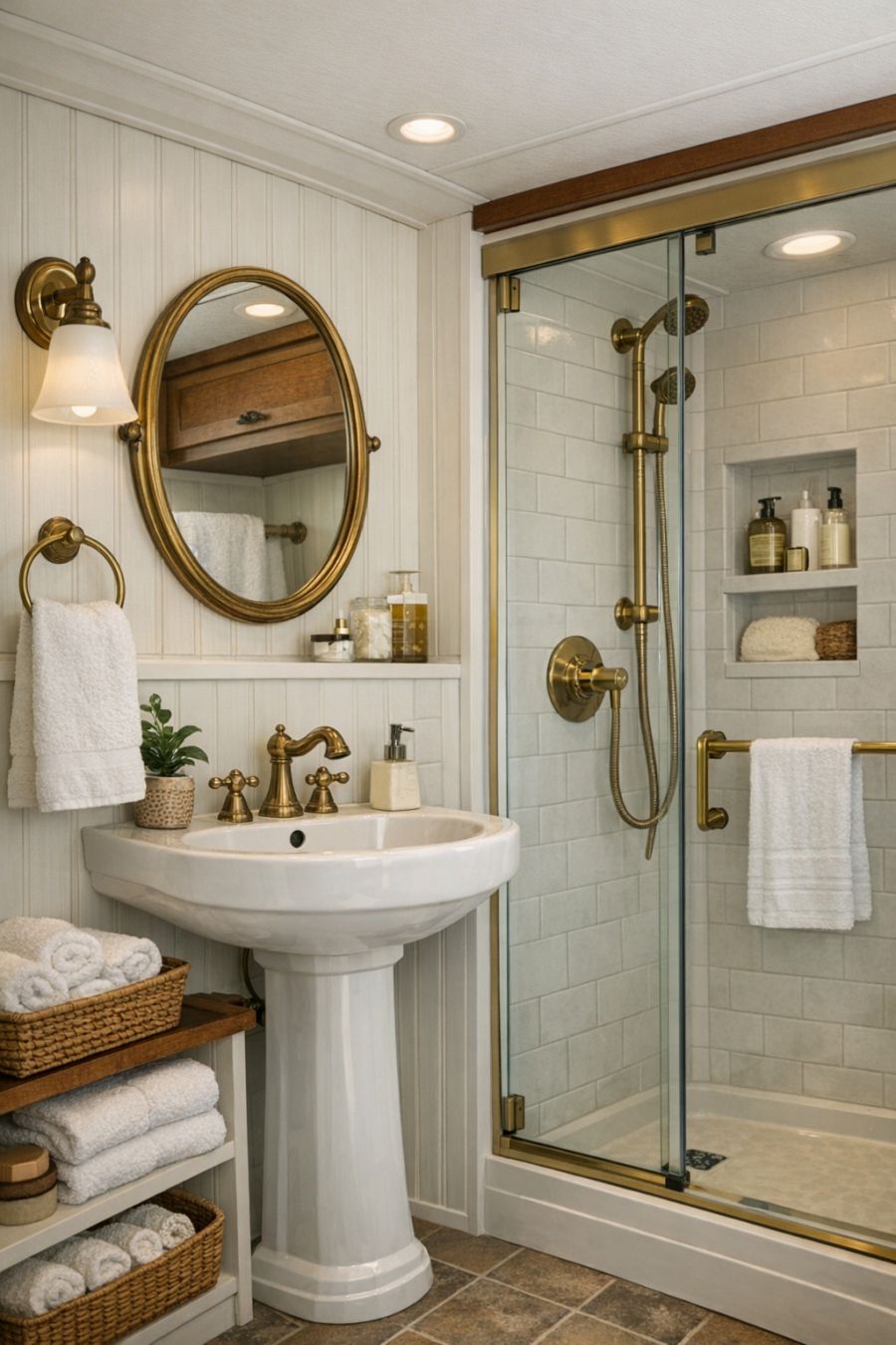 The bathroom area, though compact, is designed with both elegance and practicality in mind. Walls are clad in light, water-resistant panels, maintaining the cottage's signature style while ensuring durability. A small, pedestal sink is complemented by brass fixtures that add a touch of vintage charm. The shower area is enclosed with glass, making the space feel larger and more open. Thoughtful storage niches provide space for toiletries and towels, and a strategically placed mirror enhances the room's brightness and sense of space.