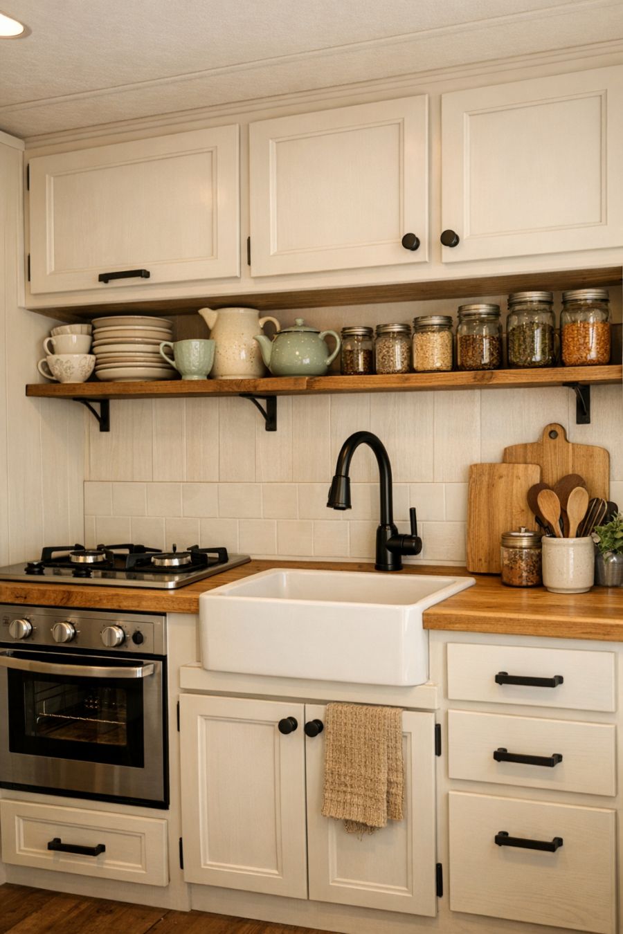 The kitchen is a model of efficiency and style, with custom cabinetry in a creamy white finish that offers ample storage. The countertops are crafted from a durable, light-toned wood, providing warmth and a natural feel. A compact yet fully equipped cooking area includes a two-burner stove, a small oven, and a farmhouse-style sink. Open shelving above the countertops displays a collection of vintage dishware and charming mason jars filled with spices. The kitchen's layout makes meal preparation a joy, with every detail thoughtfully considered for both function and aesthetics.