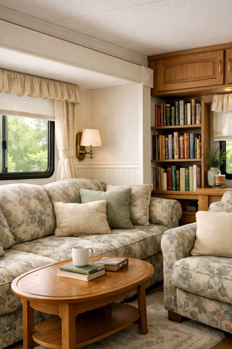 Step inside to find a living area that feels both spacious and intimate, thanks to its clever design and soothing color palette. The walls are painted in a gentle off-white, with wainscoting details that echo the exterior's charm. Plush seating in a muted floral pattern offers comfort and style, while throw pillows in matching tones add layers of coziness. A small, built-in bookshelf houses an array of classic novels and travel guides, inviting you to curl up with a good read. The space is bathed in natural light from strategically placed windows, enhancing the serene atmosphere of the room.