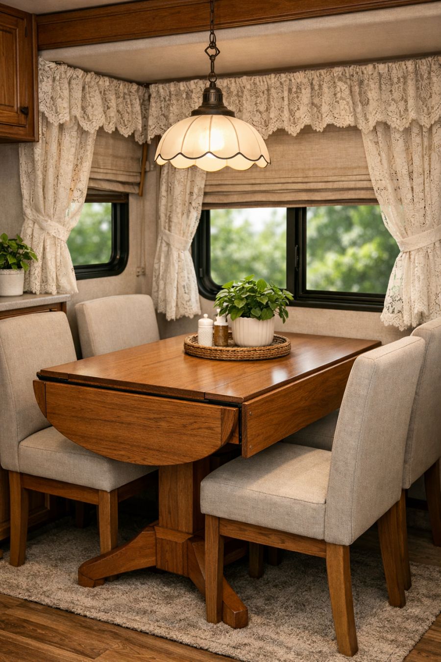 The dining area is a testament to the art of compact living, featuring a charming drop-leaf table that can be expanded for guests. Surrounding it are cushioned chairs in a soft, neutral fabric, providing both comfort and elegance. Above the table hangs a vintage-inspired pendant light, casting a gentle glow during meals. The area is accented with delicate lace curtains and a small, potted plant, bringing a touch of the outdoors inside. This cozy nook is perfect for both intimate dinners and leisurely breakfasts while enjoying the view outside.