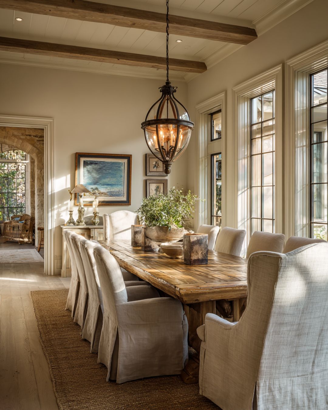 The dining area is a testament to classic elegance, with a large wooden table taking center stage. Surrounded by high-backed chairs upholstered in soft linen, the setting is perfect for intimate dinners or lively family meals. A wrought-iron chandelier hangs overhead, casting a warm glow that complements the natural daylight streaming through the nearby windows. The walls are adorned with tasteful artwork and subtle moldings, creating a sophisticated yet inviting atmosphere.
