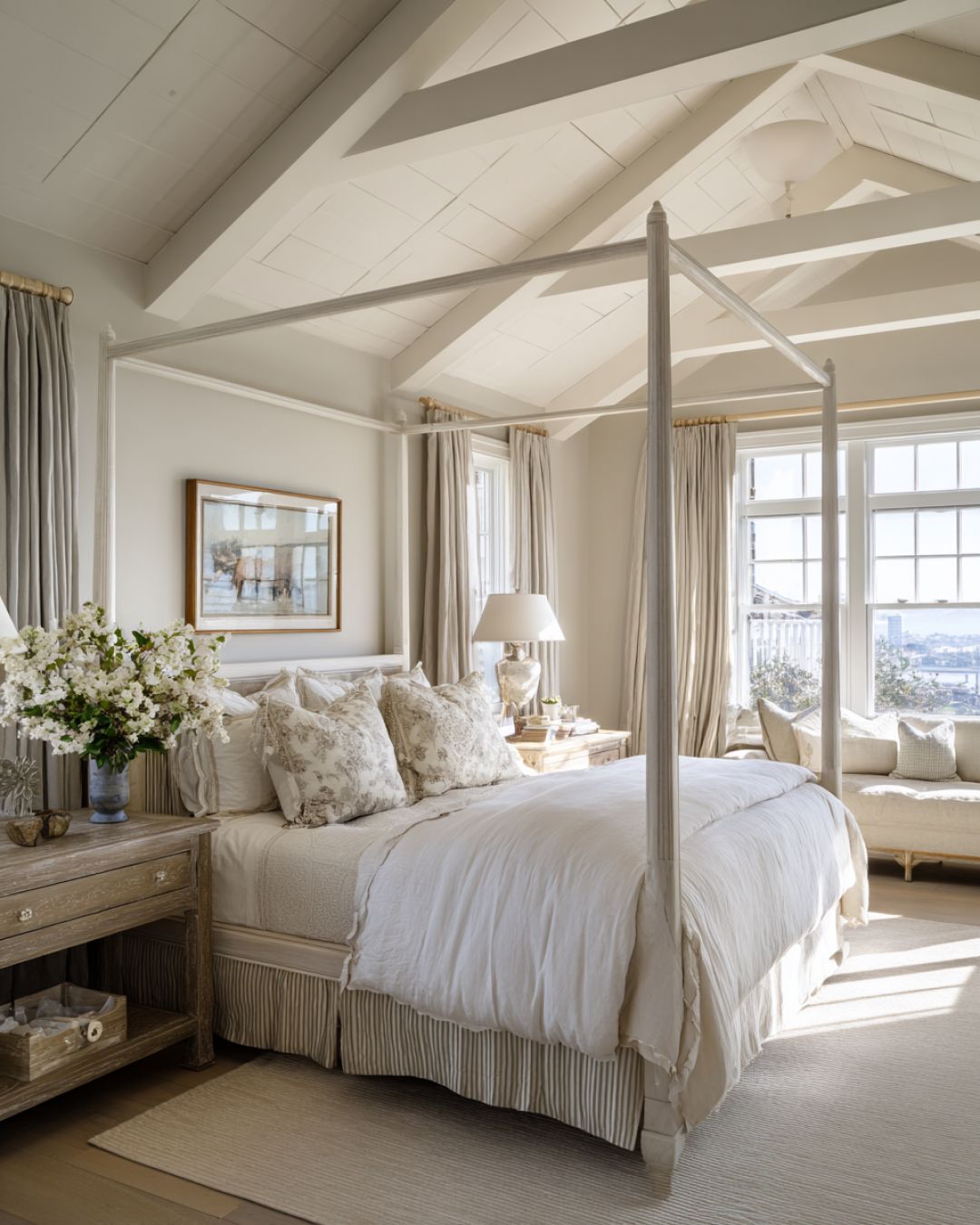 The bedroom is a serene retreat, designed to promote relaxation and restful sleep. Soft, neutral colors dominate the space, with plush textiles adding layers of comfort. A four-poster bed, draped in light, airy fabrics, serves as the room's centerpiece, inviting you to unwind in style. Large windows allow for generous natural light, while heavy drapes offer privacy and a touch of luxury. Antique-inspired furnishings and delicate decorative accents complete the room's elegant ambiance.