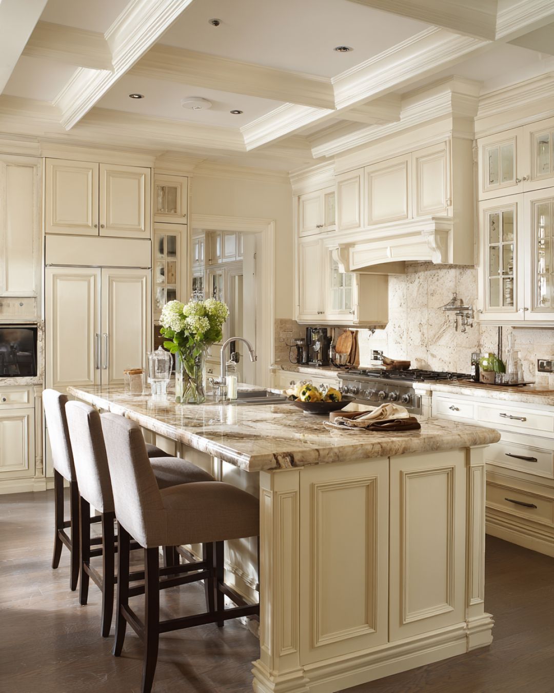 The kitchen is a harmonious blend of functionality and timeless design. Custom cabinetry in a soft cream finish provides ample storage, while marble countertops offer a durable and stylish workspace. A central island serves as both a practical prep area and a casual dining spot, equipped with high-backed stools for comfort. State-of-the-art appliances are seamlessly integrated into the traditional design, ensuring that the kitchen is as efficient as it is beautiful.